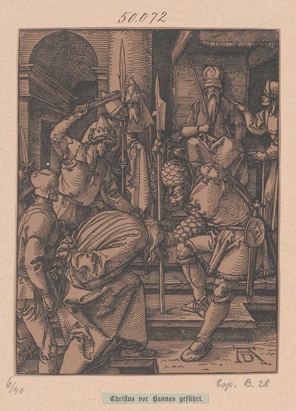 CC0Albrecht Dürer(Nürnberg 1471–1528 Nürnberg)Künstler_inTitelChristus vor AnnasSerientitel: Kleine PassionDatierungEntwurf: um 1508 - 1509Material / TechnikHolzschnittTrägermaterialPapierMaßeObjektmaß: 127 x 97 mmInventarnummerDG-201GattungDruckgrafikSammlungsbereichKupferstichkabinettMehr anzeigen⌵Beschriftung / SignaturMonogramm: "AD" (recto, unten rechts)Nummerierung: "101" (verso, unten links)StempelSammlungsstempel Akademie Wien (Quelle: Lugt (L.1627)), (recto, unten rechts)Wasserzeichennicht vorhandenWerkverzeichnisBartsch VII.120.32 Meder 1932.138.137 Schoch II.305.198Edition / Auflageohne TextProvenienzLegat Franz Jäger, 1839Wissen Sie mehr zu diesem Objekt?Verwandte Objekte(1)(Kopie) Carl August Deis, Christus vor Annas geführt, 1856