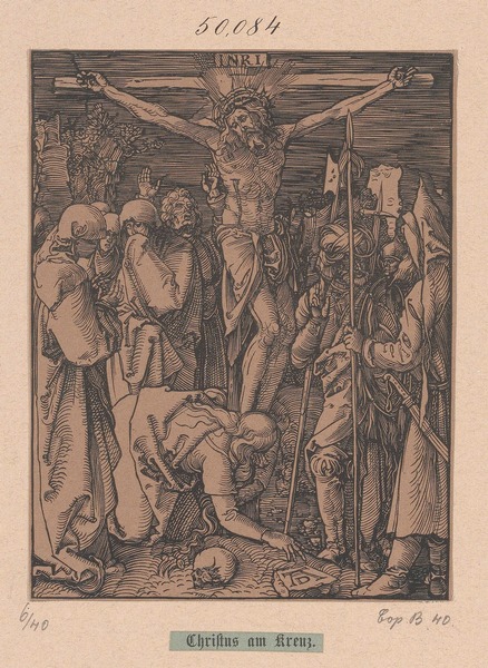 CC0Albrecht Dürer(Nürnberg 1471–1528 Nürnberg)Künstler_inTitelChristus am KreuzSerientitel: Kleine PassionDatierungEntwurf: 1509Material / TechnikHolzschnittTrägermaterialPapierMaßeObjektmaß: 128 x 95 mmInventarnummerDG-209GattungDruckgrafikSammlungsbereichKupferstichkabinettMehr anzeigen⌵Beschriftung / SignaturMonogramm: "AD" (recto, unten Mitte)Beschriftung: "INRI" (recto, oben Mitte)Nummerierung: "25" (verso, Mitte)Nummerierung: "109" (verso, unten links)Beschriftung: "J." (verso, unten links)StempelSammlungsstempel Akademie Wien (Quelle: Lugt (L.1627)), (recto, oben rechts)WerkverzeichnisBartsch VII.120.40 Meder 1932.144.149 Schoch II.324.210Edition / Auflageohne Text, Datierung unklarProvenienzLegat Franz Jäger, 1839Wissen Sie mehr zu diesem Objekt?Verwandte Objekte(1)(Kopie) Carl August Deis, Christus am Kreuz, 1856