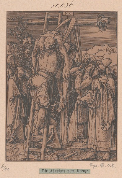 CC0Albrecht Dürer(Nürnberg 1471–1528 Nürnberg)Künstler_inTitelDie KreuzabnahmeSerientitel: Kleine PassionDatierungEntwurf: um 1509 - 1510Material / TechnikHolzschnittTrägermaterialPapierMaßeObjektmaß: 129 x 98 mmInventarnummerDG-212GattungDruckgrafikSammlungsbereichKupferstichkabinettMehr anzeigen⌵Beschriftung / SignaturMonogramm: "AD" (recto, unten links)Beschriftung: "INRI" (recto, oben Mitte)Nummerierung: "27" (verso, unten links)Nummerierung: "122" (verso, unten links)StempelSammlungsstempel Akademie Wien (Quelle: Lugt (L.1628)), (recto, oben rechts)WerkverzeichnisBartsch VII.120.42 Meder 1932.145.151 Schoch II.328.212Edition / Auflageohne TextProvenienzLegat Franz Jäger, 1839Wissen Sie mehr zu diesem Objekt?Verwandte Objekte(1)(Kopie) Carl August Deis, Kreuzabnahme, 1856