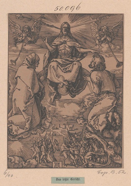 CC0Albrecht Dürer(Nürnberg 1471–1528 Nürnberg)Künstler_inTitelDas Jüngste GerichtSerientitel: Kleine PassionDatierungEntwurf: um 1510Material / TechnikHolzschnitt; TuscheTrägermaterialPapierMaßeObjektmaß: 126 x 96 mmInventarnummerDG-223GattungDruckgrafikSammlungsbereichKupferstichkabinettMehr anzeigen⌵Beschriftung / SignaturMonogramm: "AD" (recto, unten Mitte)Nummerierung: "119" (verso, unten links)StempelSammlungsstempel Akademie Wien (Quelle: Lugt (L.1627)), (recto, unten links)Wasserzeichennicht vorhandenWerkverzeichnisBartsch VII.120.52 Meder 1932.150.161 Schoch II.343.222Edition / Auflageohne TextProvenienzLegat Franz Jäger, 1844Wissen Sie mehr zu diesem Objekt?Verwandte Objekte(1)(Kopie) Carl August Deis, Das Jüngste Gericht, 1856