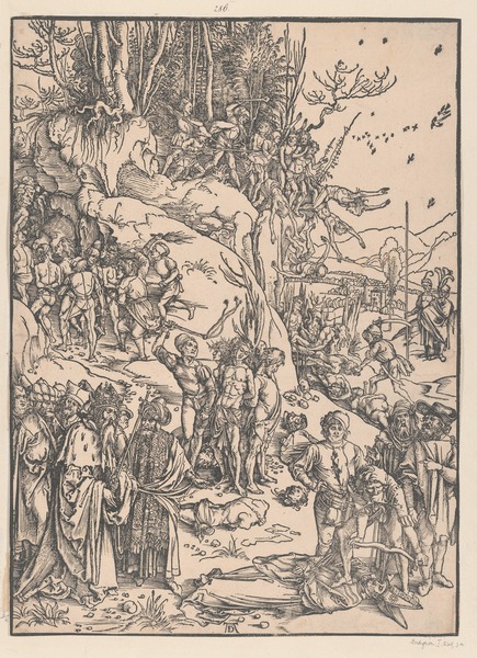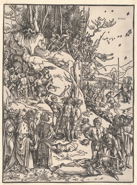 CC0UnbekanntKünstler_inKopie nachAlbrecht Dürer(Nürnberg 1471–1528 Nürnberg)Künstler_inTitelDie Marter den ZehntausendDatierungEntwurf: um 1496Material / TechnikHolzschnittTrägermaterialPapierMaßeObjektmaß: 385 x 282 mmInventarnummerDG-524GattungDruckgrafikSammlungsbereichKupferstichkabinettMehr anzeigen⌵StempelSammlungsstempel Akademie Wien (Quelle: Lugt (L.1628)), (recto, oben rechts)WasserzeichenHohe Krone (Quelle: Meder WZ 21), (unten Mitte)WerkverzeichnisBartsch VII.140.117 Meder 1932.184.218 Kopie Schoch II.41.104ProvenienzAnkauf Edward Jakob von Steinle, 1873Wissen Sie mehr zu diesem Objekt?Verwandte Objekte(2)(Original) Albrecht Dürer, Die Marter der Zehntausend, um 1497(Original) Albrecht Dürer, Die Marter der Zehntausend , um 1496