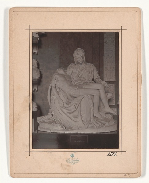 CC BY 4.0Abguss nachMichelangelo Buonarroti(Caprese Michelangelo 1475–1564 Rom)Bildhauer_inTitelRömische Pietà aus dem PetersdomDatierungAbguss: 1888Original: 1497 - 1499Material / TechnikGipsMaßeObjektmaß: 169.0 × 165.0 × 85.0 cmInventarnummerGM-RE-2GattungGipsabgussSammlungsbereichGlyptothekMehr anzeigen⌵Beschriftung / SignaturBeschriftung: wie am Original auf der Brustschleife der Madonna: MICHEL ANGELUS BONAROTUS FLORENTIN FACIEBATProvenienzGlyptotheksbestand, 1888 Plaster Cast Collection, 1888Wissen Sie mehr zu diesem Objekt?Verwandte Objekte(1)(Aufnahme) Edmund Aigner, Akademie der bildenden Künste Wien, Historische Aufstellung der Glyptothek, Pietà, 1899